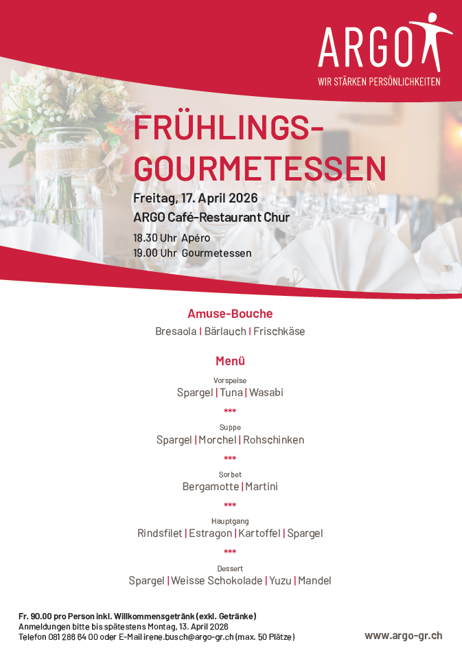 Telefon 081 286 64 00 oder E-Mail irene.busch@argo-gr.ch (max. 50 Plätze)